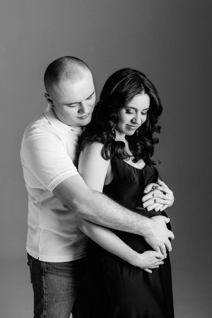 Позы акцентируют силуэт и эмоции: объятия с мужем, руки на животе (синяки не в кадре).