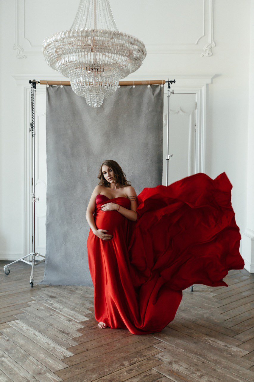 Один из самых популярных образов для беременной фотосессии — тело, задрапированное лёгкой полупрозрачной тканью: шёлком, шифоном или органзой. Тело прикрыто, но форма живота читается через ткань. Это одновременно нежно, романтично и совершенно не вульгарно.